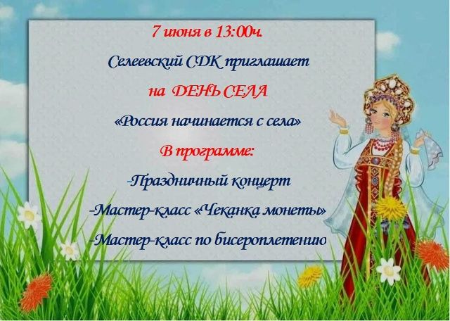 7 июня на территории Селеевского СДК состоялась праздничная программа посвященная дню села "Россия начинаеться с села". Первые поздравления в адрес жителей и нашего села от Главы Поддорского округа Елены Викторовны Паниной, она пожилала жителям крепкого здоровья,счастья,отличного настроения благополучия,мира, удачи и успеха во всех делах, а деревне- счастливого будущего,новых побед и достижений,дальнейшего развития и процветания! Отметила ТОСовцев,которые активно учавствуют в благоустройстве своего села.Глава Селеевского поселения Галина Анатольевна Иванова присоединилась к поздравлениям и поблагодарила жителей за сплоченность,сопереживание и помощь СВО.Особо отметила женщин,которые ежедневно,как на работу, ходят плести маскировочные сети,это Кострова М.Г. и Ефремова С.А.,поздравила свадебных юбиляров а так же поблагодарила всех участников праздничного концерта за активное участие и помощь в проведении праздника.В этом году в деревни один первоклассник -Данилова Анечка.Её поздравила Глава поселения и пожелала учиться на отлично.Ирина Ивановна Эльсон -директор МАУ"ПМСКО", так же поздравила жителей и госте села с праздником и объявила благодарность детям за активное участие в культурно-массовых мероприятиях Селеевского СДК.Рботники Одела народного творчества Надежда Кондратьева и Елена Федорова провели для детей мастер-класс по бисероплетению. Директор Поддорского краеведческого музея- Елена Степанова, порадовала жителей и гостей нашего села чеканкой монет,где каждый собственными руками смог освоить это искусство.В празднике приняли участие Образцовый художественный коллектив Хареографический ансамбль "Фантазия", солисты Районного Дома Культуры София Смелкова и Виктор Александров,Анастасия Балюк(г.Великий Новгород).